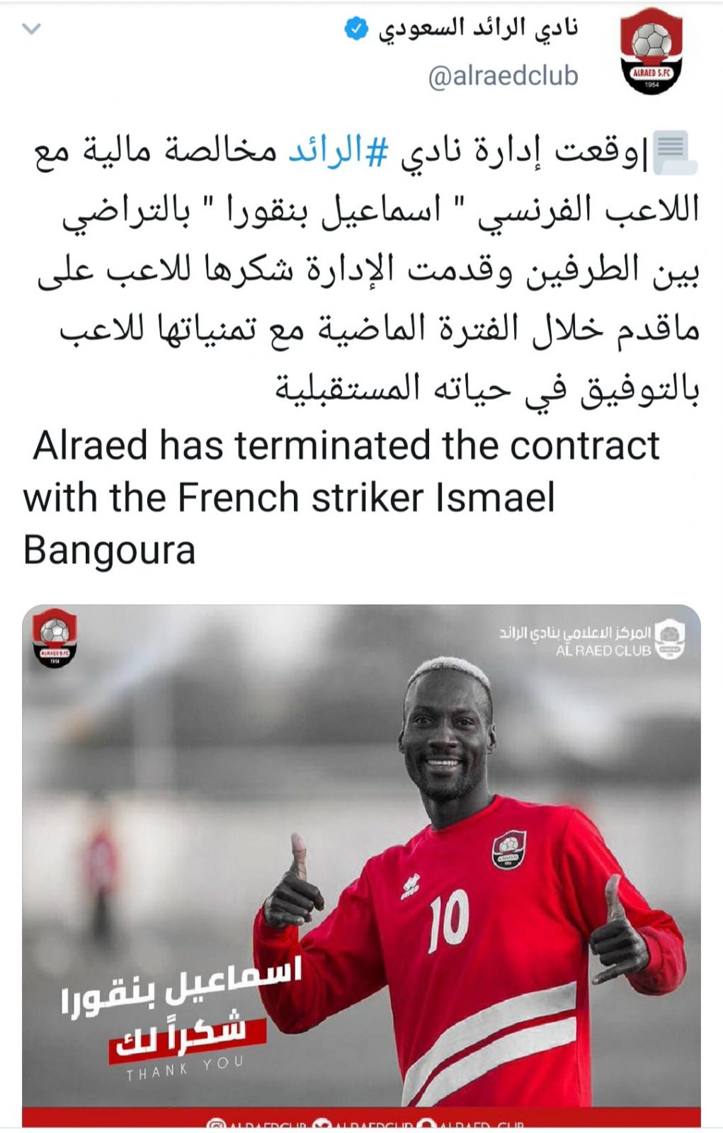 ووجهت إدارة النادي الشكر للاعب عبر حسابه الرسمي بموقع التواصل الإجتماعي “تويتر”: “وقعت إدارة نادي الرائد مخالصة مالية مع اللاعب الفرنسي “اسماعيل بنقورا” بالتراضي بين الطرفين”.