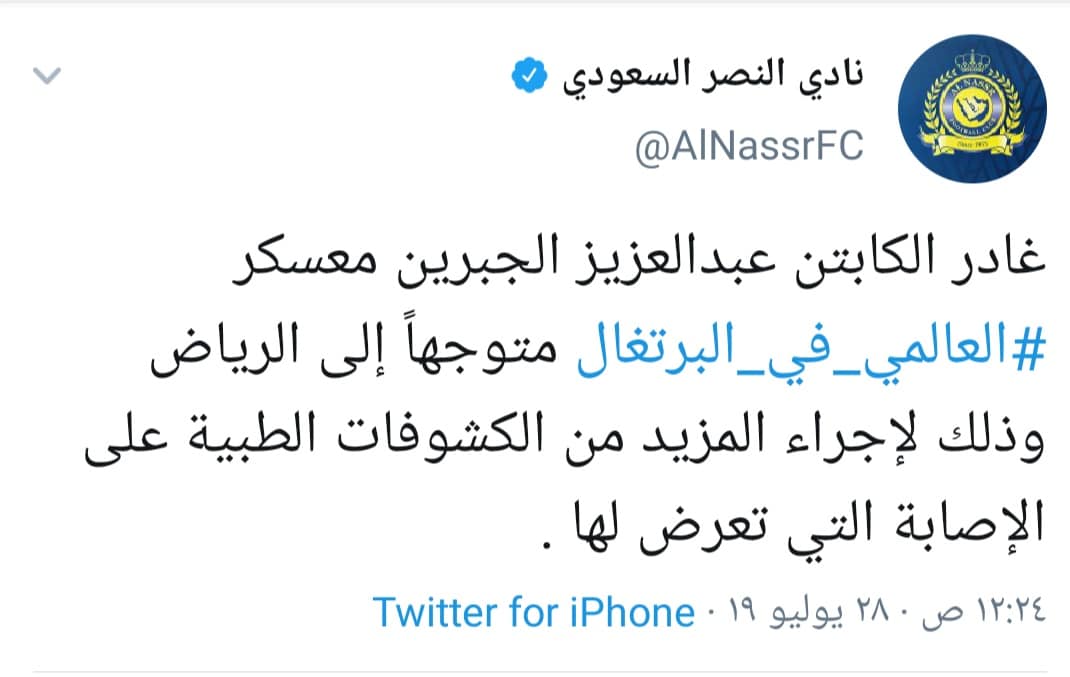 وأعلن الحساب الرسمي للنادي عبر موقع التواصل الاجتماعي “تويتر” عن مغادرة اللاعب وكتب: “غادر الكابتن عبدالعزيز الجبرين معسكر العالمي في البرتغال متوجهًا إلى الرياض وذلك لإجراء المزيد من الكشوفات الطبية على الإصابة التي تعرض لها”.