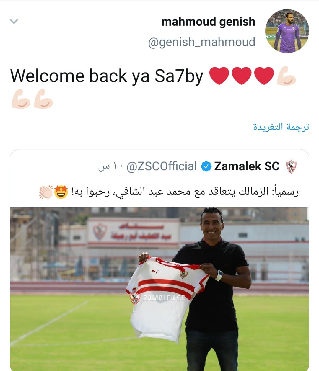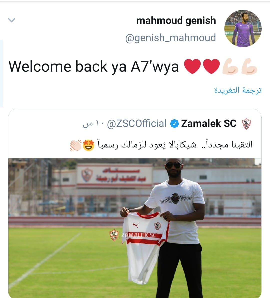 بينما أعاد “جنش” نشر صورة لمحمد عواد وكتب عليها: “مبروك ياحبيبي”، كما قام بالترحيب أيضًا بمحمد عبد الشافي ومحمود عبد الرازق شيكابالا، لعودتهم إلى صفوف القلعة البيضاء.