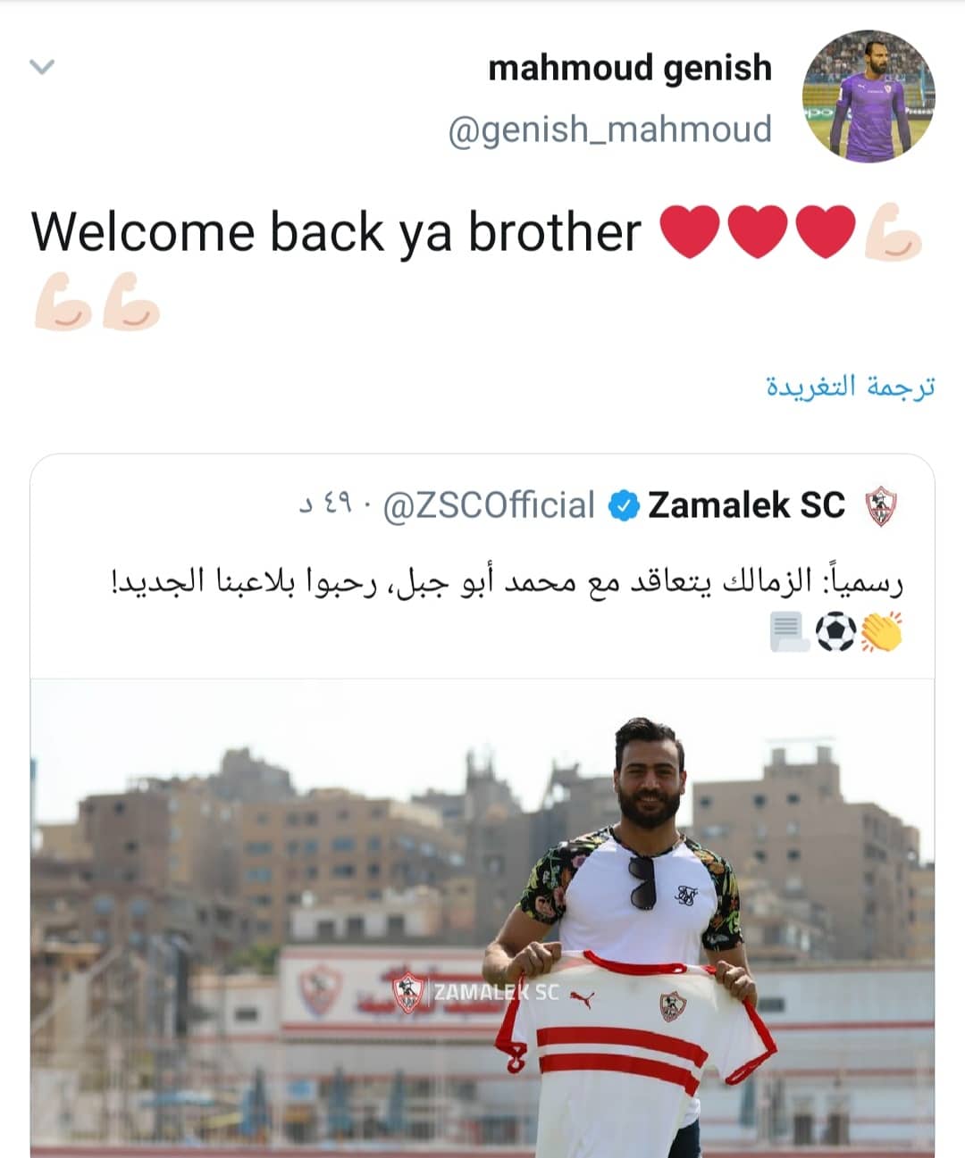 وقام “جنش” عبر حسابه الرسمي بموقع التواصل “تويتر” بإعادة نشر صورة للحارس محمد أبو جبل وكتب عليها: “مرحبًا بعودتك ياأخي”.
