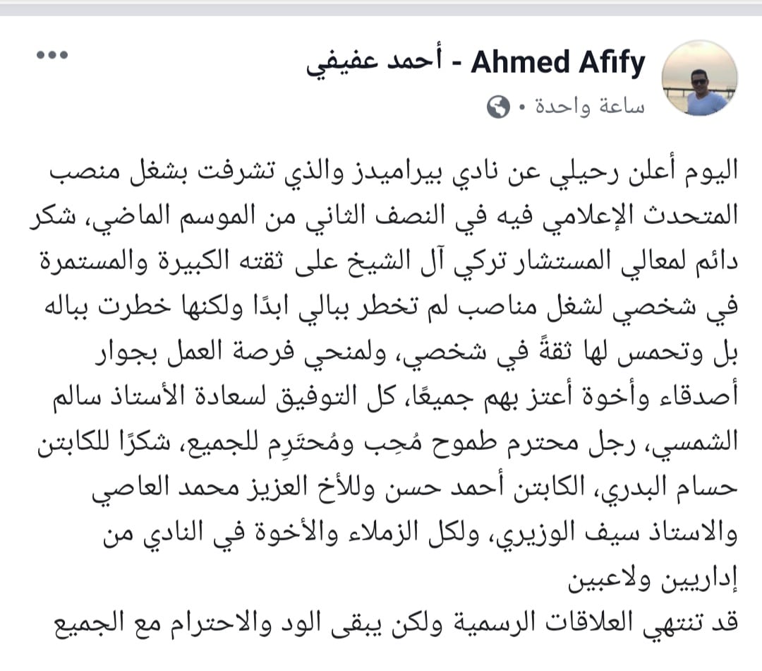 وقال عفيفي في بيان استقالته من نادي بيراميدز عبر حسابه الرسمي على موقع التواصل الاجتماعي “فيس بوك”: “اليوم أعلن رحيلي عن نادي بيراميدز والذي تشرفت بشغل منصب المتحدث الإعلامي فيه في النصف الثاني من الموسم الماضي”.
