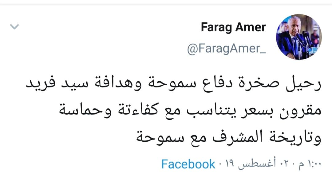 وفي تدوينة أخرى كتب: “رحيل صخرة دفاع سموحة وهدافة سيد فريد مشروط بسعر يتناسب مع كفاءته وحماسه وتاريخه المشرف مع سموحة”.