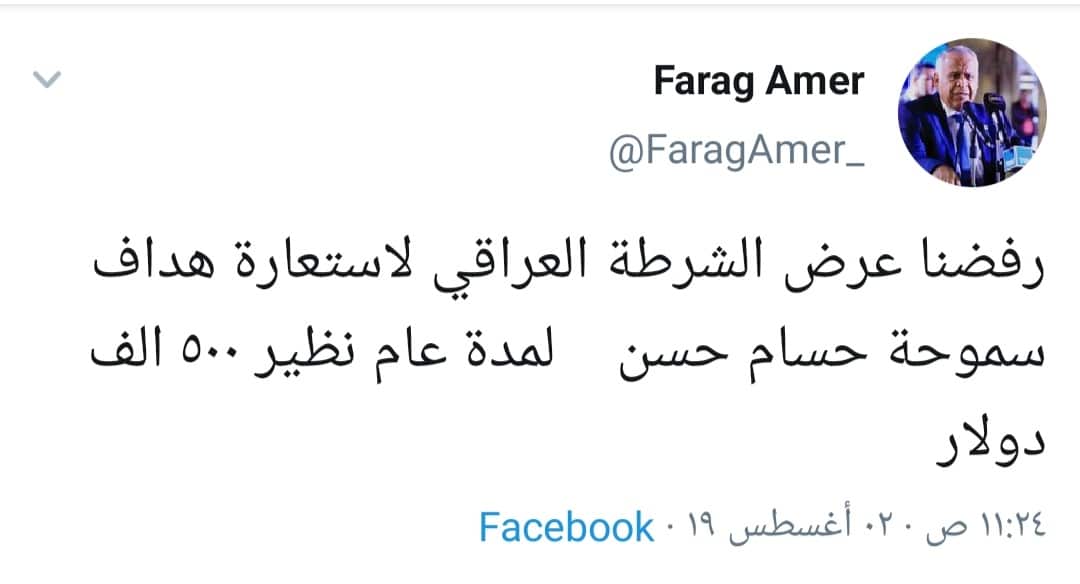 وفي تغريدة أخرى عن مهاجم الفريق قال: “رفضنا عرض الشرطة العراقي لاستعارة هداف سموحة حسام حسن، لمدة عام نظير 500 ألف دولار”.