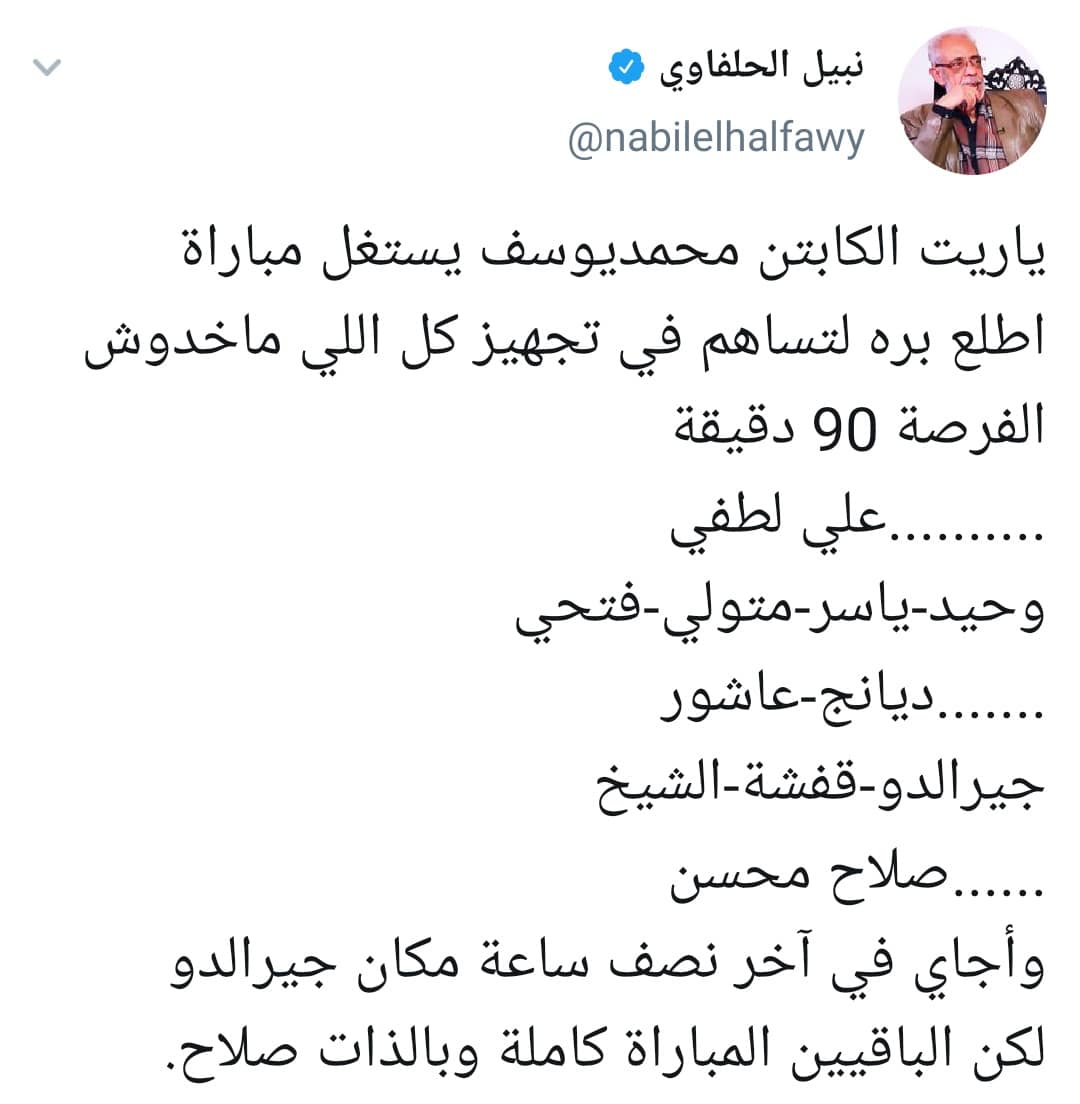 وكتب نبيل الحلفاوي عبر حسابه على موقع التواصل الإجتماعي “تويتر” رسالة موجهة إلى محمد يوسف : “باستغلال مباراته القادمة أمام اطلع بره بطل جنوب السودان في الدور التمهيدي لمسابقة دوري أبطال أفريقيا”.