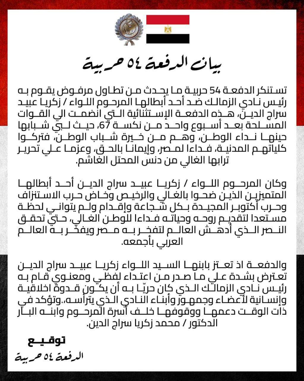 وقال البيان:”تستنكر الدفعة 54 حربية ما يحدث من تطاول مرفوض يقوم به رئيس نادي الزمالك ضد أحد أبطالها اللواء زكريا عبيد سراج الدين”.