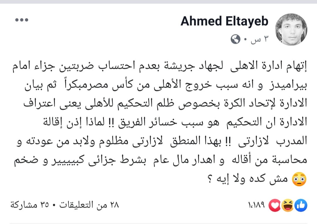 وكتب الطيب عبر حسابه الخاص على موقع التواصل الإجتماعي “فيس بوك”: “إتهام ادارة الاهلى لجهاد جريشة بعدم احتساب ضربتين جزاء أمام بيراميدز وأنه سبب خروج الأهلى من كأس مصر مبكراً ثم بيان الإدارة لإتحاد الكرة بخصوص ظلم التحكيم للأهلى يعنى اعتراف الادارة ان التحكيم هو سبب خسائر الفريق !!”.