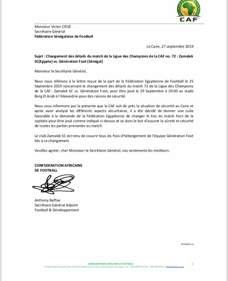 نشر أمير مرتضى منصور المشرف العام على فريق الكرة بنادي الزمالك، الخطاب الذي أرسله الاتحاد الإفريقي لكرة القدم “كاف”، لإقامة مباراة الفارس الأبيض أمام نظيره بطل السنغال، على ملعب برج العرب بمدينة الإسكندرية.