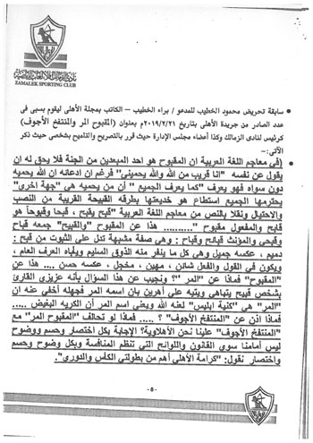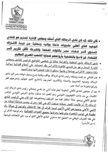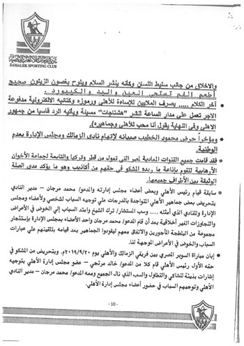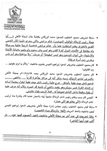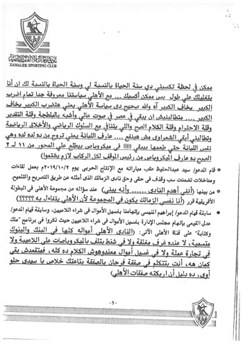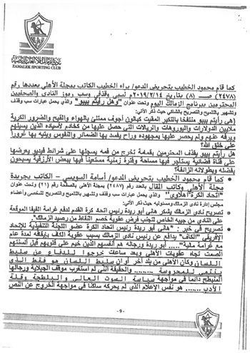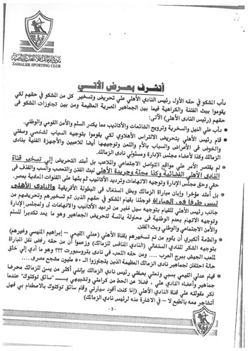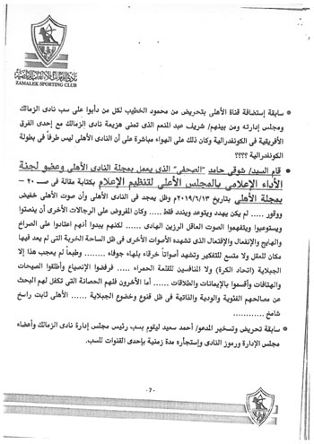 وكذلك تسخير قناة الأهلي الفضائية ومجلة النادي لبث الفتن والتعصب والسب والقذف واتهام الزمالك ومجلس إدارته، بعدم الوطنية.