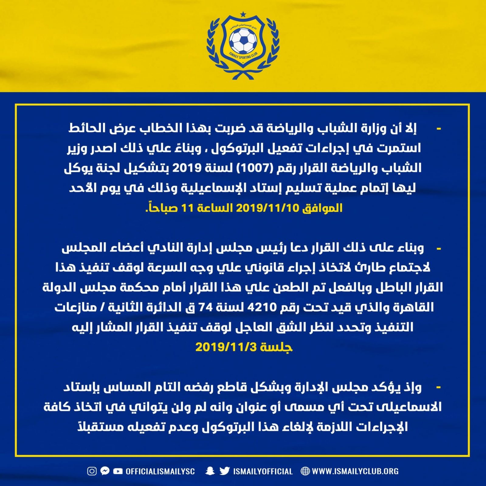 وجاء بيان النادي الإسماعيلي كالتالي: