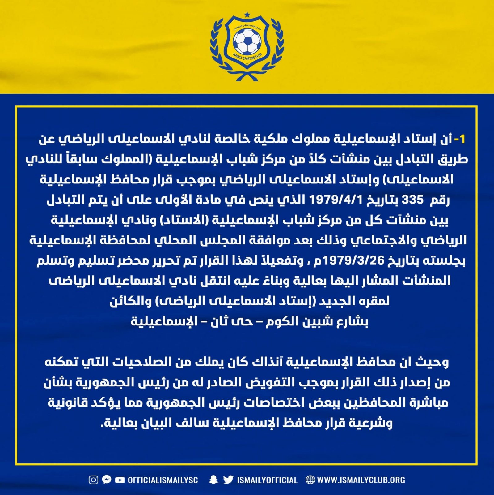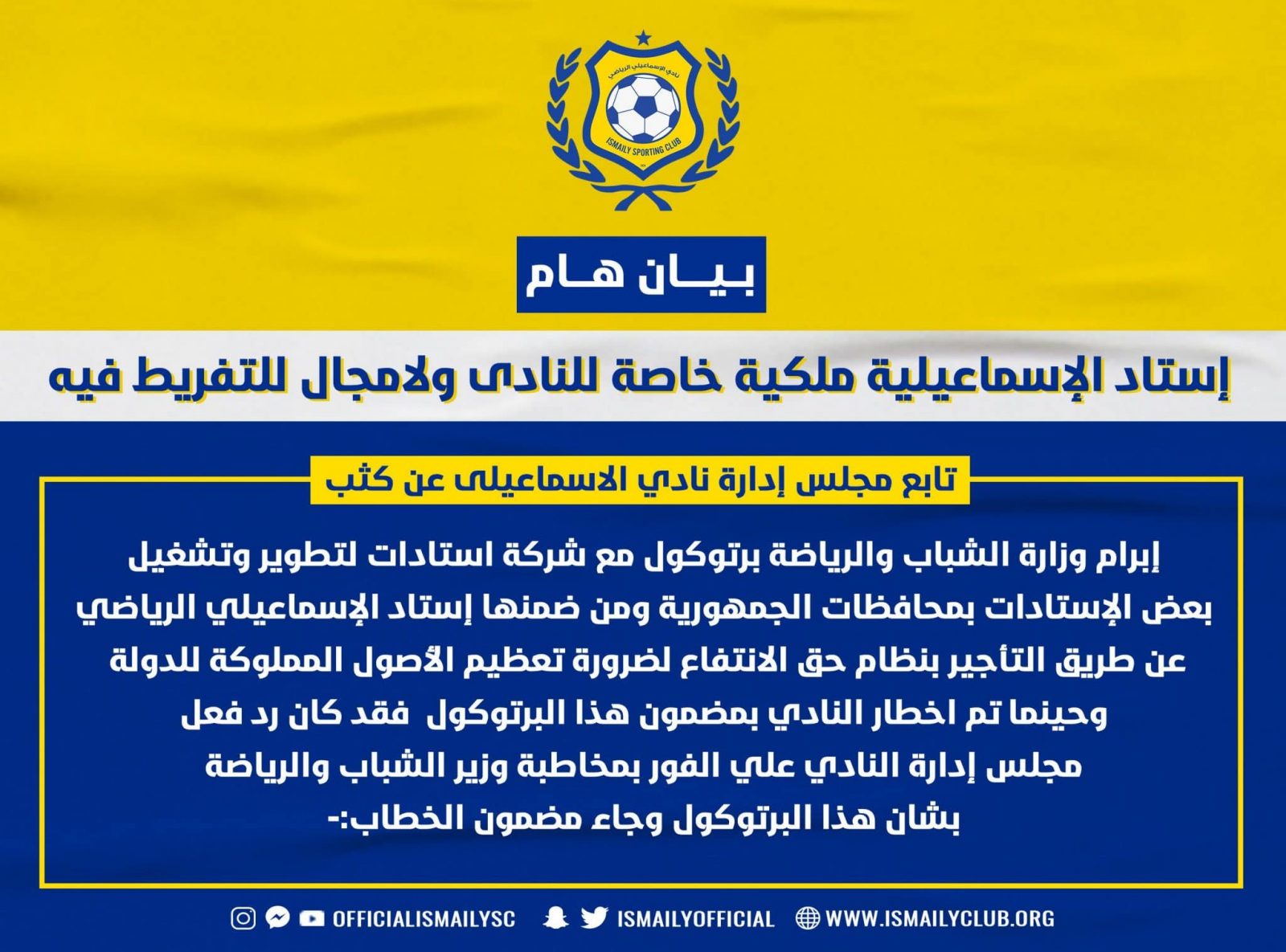 أصدر مجلس إدارة النادي الإسماعيلي بيانًا يعلن فيه أن استاد الإسماعيلية ملكية خاصة للنادي ولا مجال للتفريط فيه.