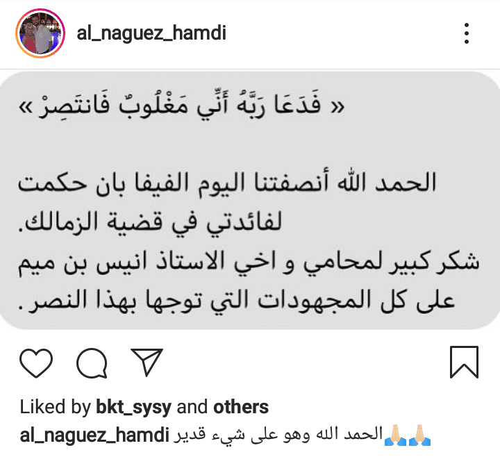 وكتب حمدي النقاز على حسابه الخاص بالانستجرام: “فدعا ربه أني مظلوم فانتصر، الحمد لله أنصفتنا اليوم الفيفا بأن حكمت لفائدتي في قضية الزمالك”.