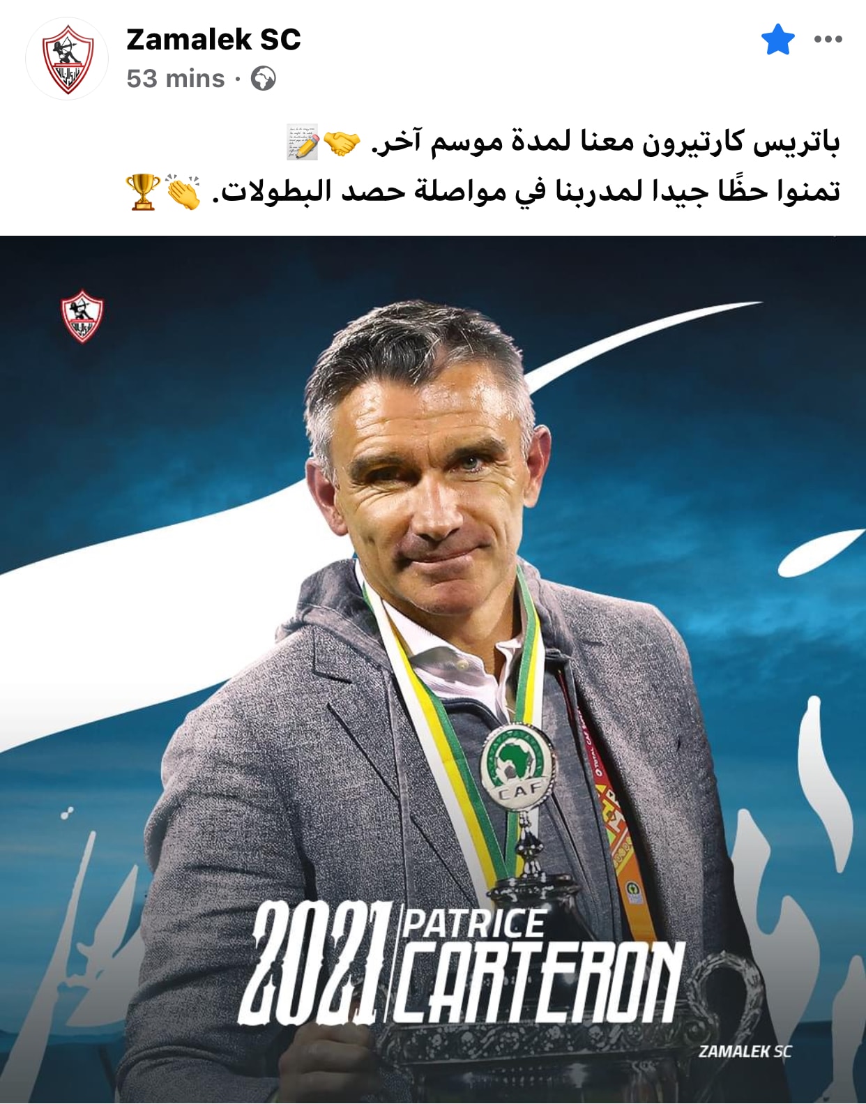 أعلن الموقع الرسمي للزمالك، على صفحته الخاصة بأحد مواقع التواصل الاجتماعي الفيس بوك، تجديد الفرنسي باتريس كارتيرون للقلعة البيضاء لمدة عام جديد.
