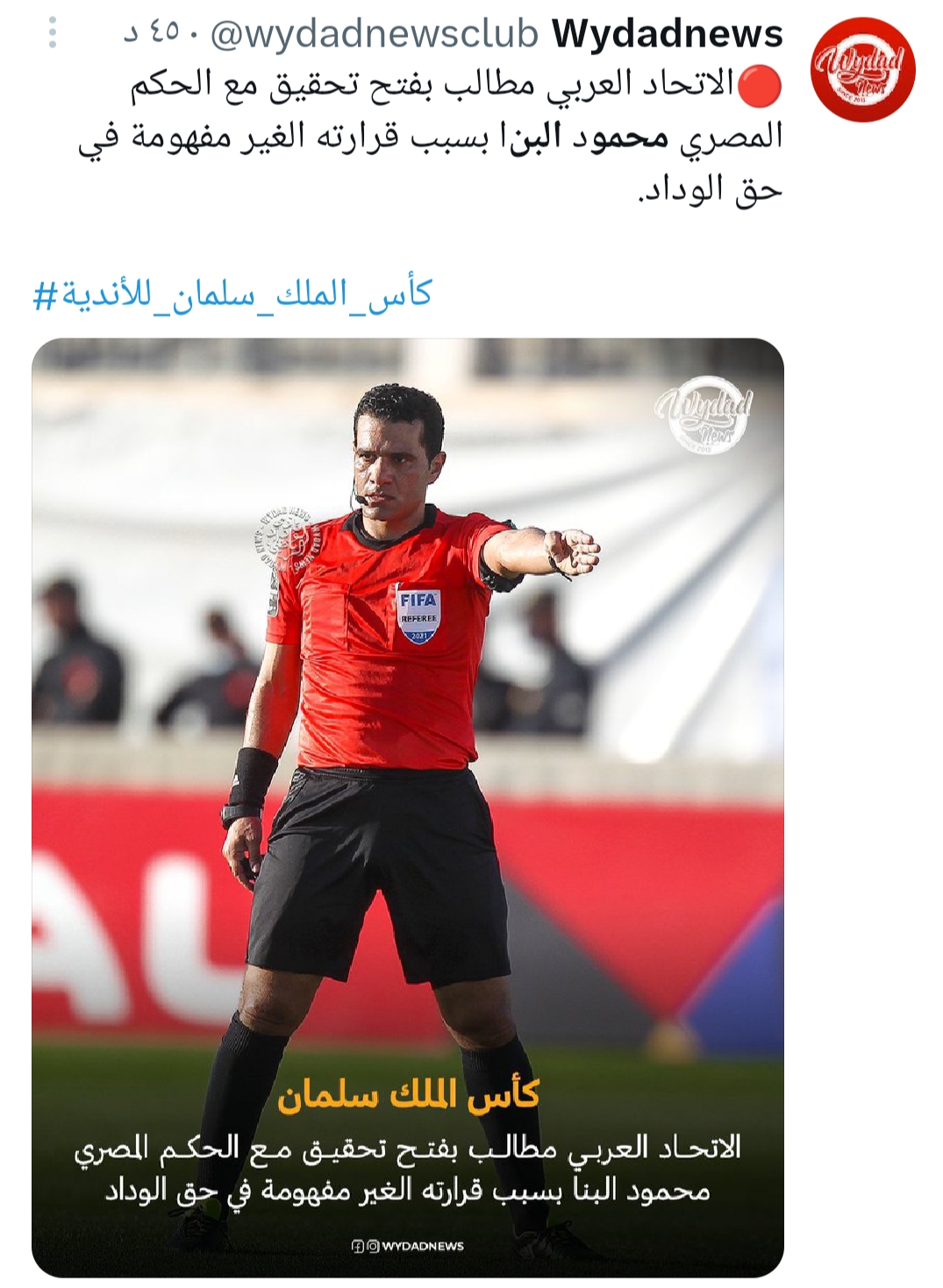 وطالبت جماهير الوداد المغربي الاتحاد العربي لكرة القدم بفتح تحقيقا عاجلا مع الحكم البنا بسبب قرارته الغير مفهومة على حد وصفهم.