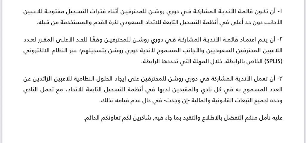وأكدت اللجنة في خطابها إلى أندية الدوري السعودي: ” أن تكون قائمة الأندية المشاركة في دوري روشن أثناء فترات التسجيل مفتوحة للاعبين الأجانب دون حد أعلى في أنظمة التسجيل”.