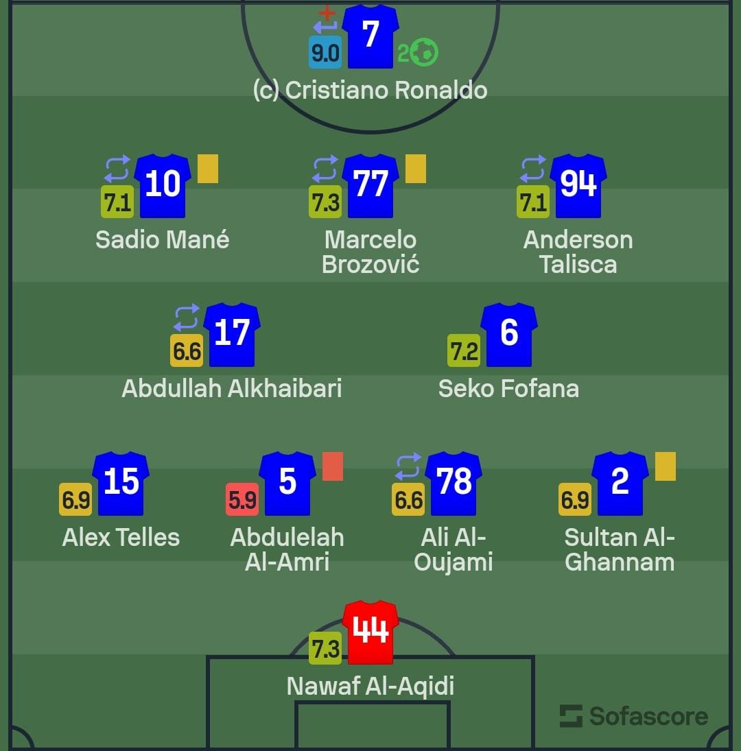 وفقا لموقع سوفا سكور العالمي للإحصائيات فقد حصل رونالدو على أعلى تقييم في لاعبي النصر السعودي بدرجة 9.0، بينما حصل بروزفيتش على درجة 7.3، والسنغالي ساديو ماني على درجة7.1.