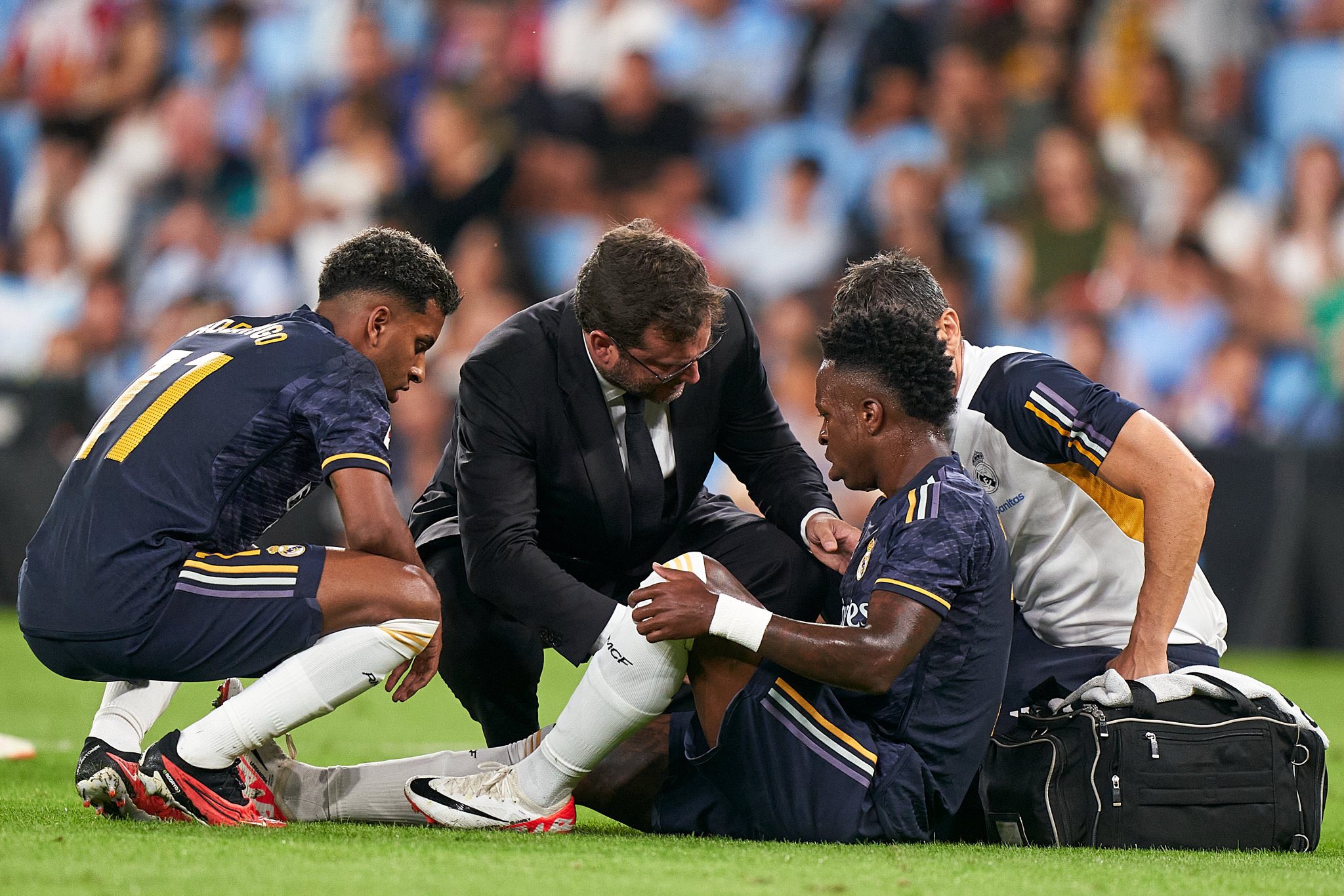 وجاء بيان ريال مدريد كالتالي: “بعد الفحوصات التي أجريت اليوم على لاعبنا فينيسيوس جونيور من قبل الخدمات الطبية في ريال مدريد، تم تشخيص إصابته بتمزق في العضلة ذات الرأسين الفخذية مع إصابة الوتر البعيد في ساقه اليسرى”.