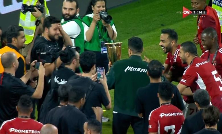 واحتفل حماقي مع الجماهير بكأس السوبر المحلي، بعدما أشعل الأجواء بأغانيه الخاصة بالنادي الاهلي.