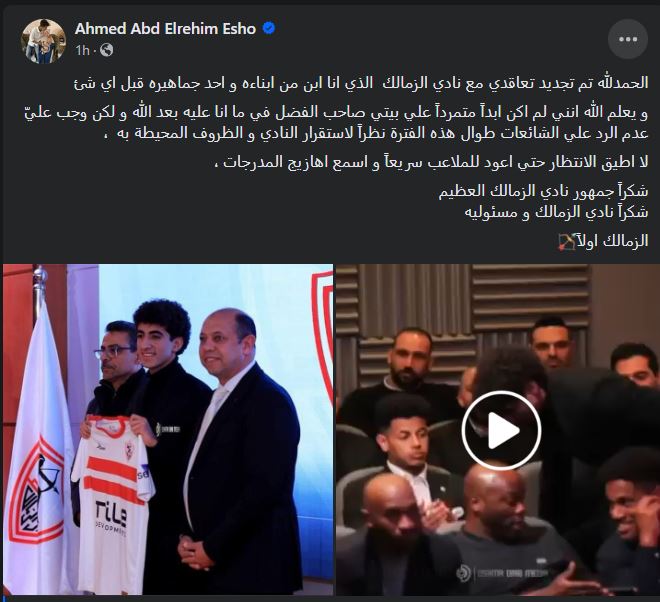 وقال إيشو عبر حسابه الشخصي بموقع التواصل الاجتماعي فيسبوك: “الحمدلله تم تجديد تعاقدي مع نادي الزمالك الذي أنا ابن من أبناءه وأحد جماهيره قبل أي شيئ”.
