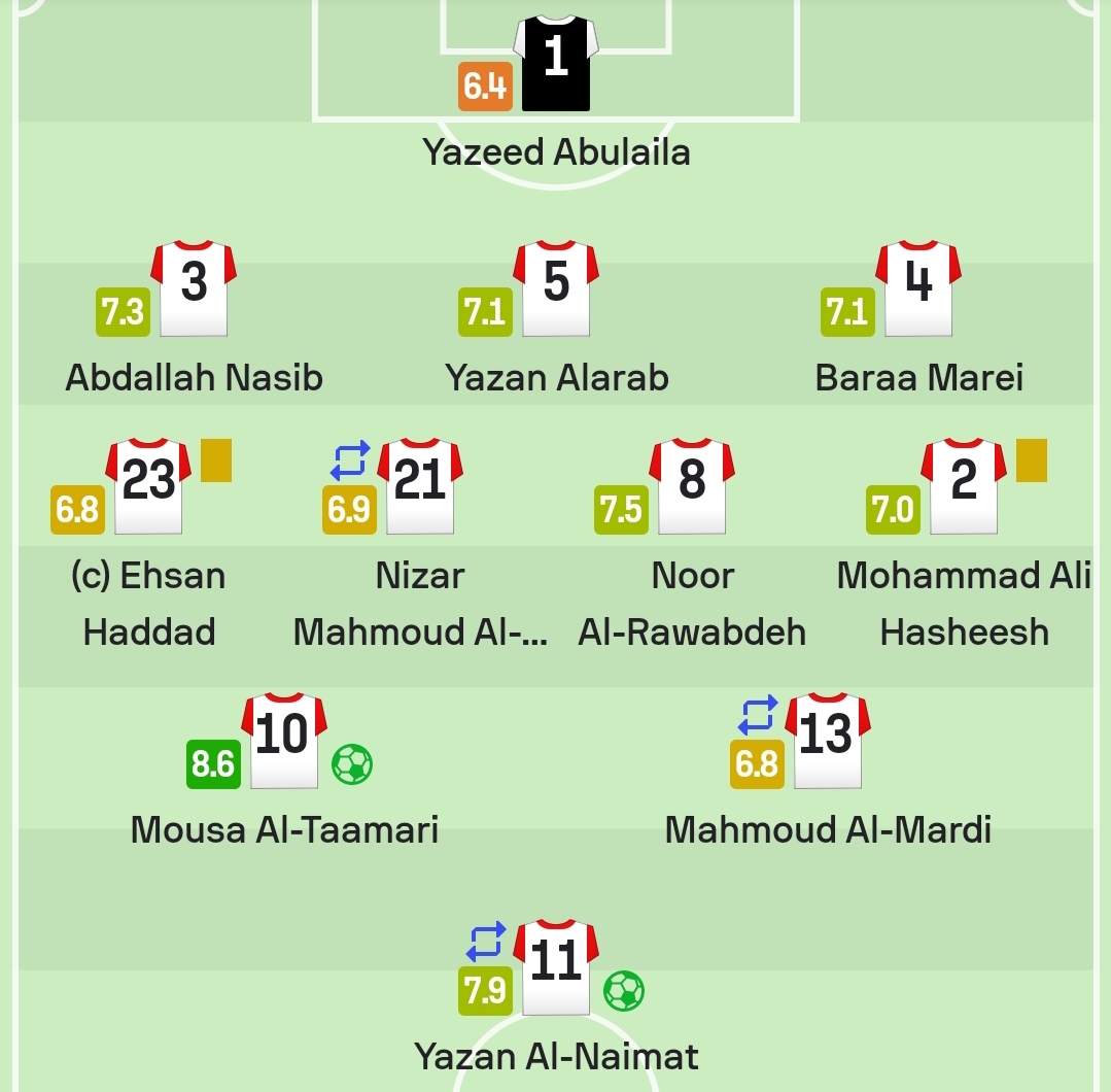 حصل موسى التعمري نجم منتخب الأردن على أعلى تقييم في مباراة كوريا الحنوبية وفقًا لموقع سوفا سكور العالمي للإحصائيات بـ8.6، ويليه اللاعب يزن النعيمات بـ7.9.