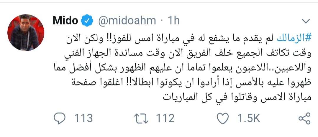 ونشر ميدو تغريدة عبر حسابه الرسمي على تويتر قال فيها: “الزمالك لم يقدم ما يشفع له في مباراة أمس للفوز!!، ولكن الآن وقت تكاتف الجميع خلف الفريق، الآن وقت مساندة الجهاز الفني واللاعبين”.