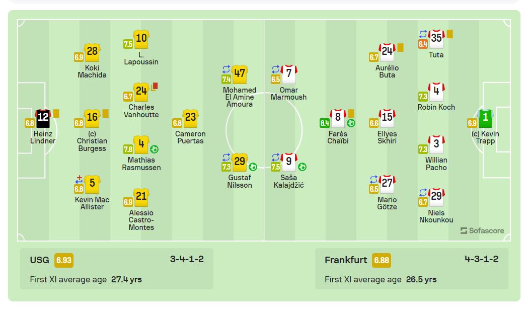 سجل فريق فرانكفورت، أهدافه عن طريق الجزائري فارس شايبي في الدقيقة 3، ثم في الدقيقة 10 تلقى شايبي تمريرة من عمر مرموش وحولها لتمريرة حاسمة أخرى، سجل منها ساسا كالادجيتش الهدف الثاني لفرانكفورت.