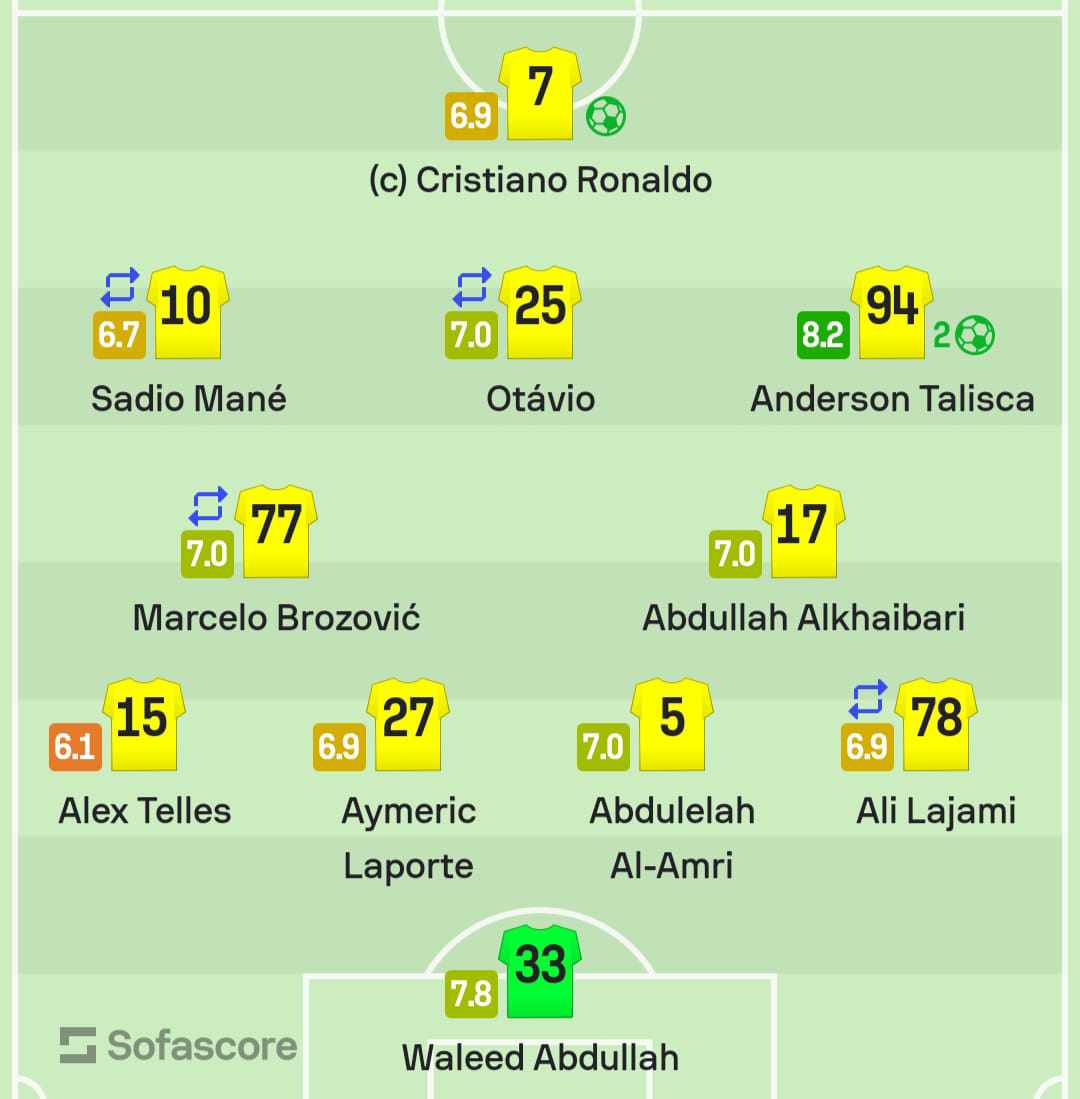 ووفقاً لشبكة “سوفا سكور” للأرقام والإحصاءات، فإن تاليسكا هو الأفضل في المباراة بتقييم 8.2، بينما حصل رونالدو على 6.9.