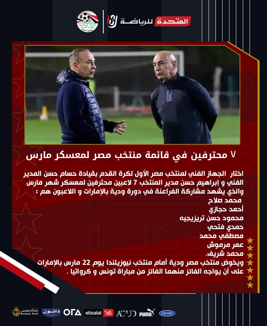 أعلن المدرب حسام حسن، المدير الفني لمنتخب الأول لكرة القدم، ٧ لاعبين محترفين لمعسكر شهر مارس والذي يشهد مشاركة الفراعنة في دورة ودية بالإمارات.