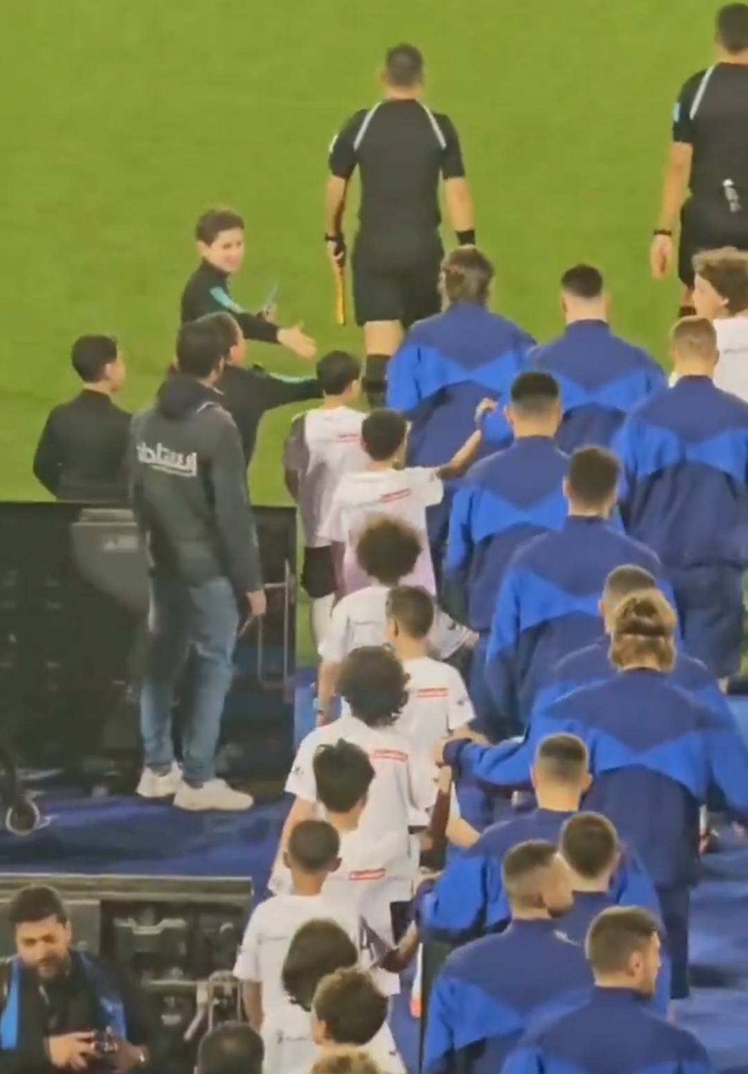 وقام طفل بلمس النجم الكرواتي مودريتش عند دخوله إلى أرض الملعب، في تصرف مثير منه، حيث لا يصدق أنه يرى لاعب ريال مدريد أمامه.