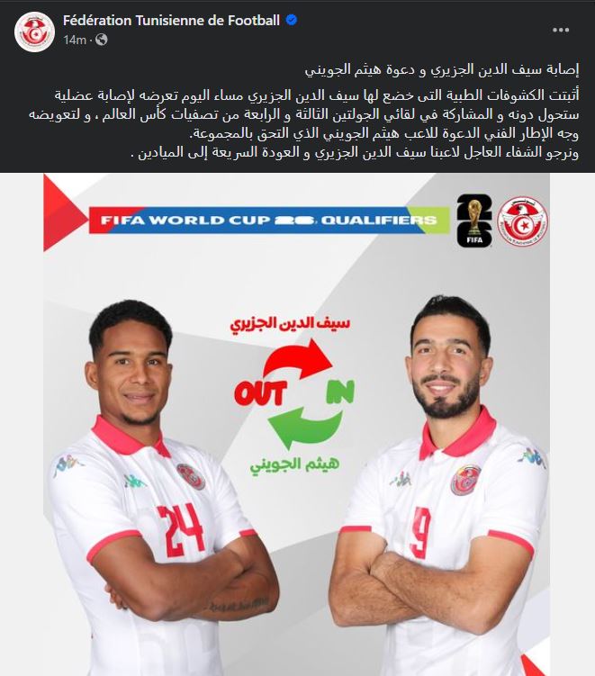 وأضاف: “لتعويضه وجه الإطار الفني الدعوة للاعب هيثم الجويني الذي التحق بالمجموعة”.