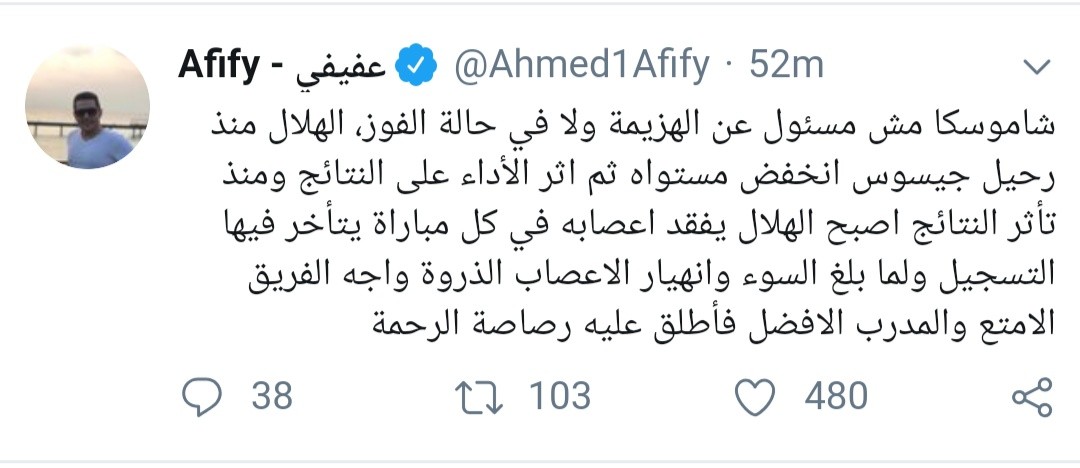 ونشر عفيفي على حسابه الشخصي ” تويتر” :”الهلال لو قعد يهاجم يومين مش هيسجل .. اللاعيبة بيدخلوا منطقة الجزاء مبيشوفوش المرمى”.