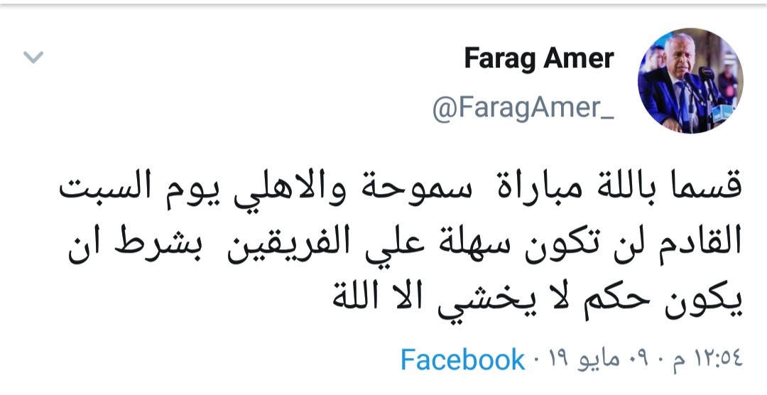 وقد أشار عامر مسبقًا عبر حسابه الشخصي “بتويتر” إلى تأثير التحكيم على نتيجة مباراة فريقه قائلًا:”قسمًا بالله مباراة سموحة والأهلي السبت القادم، لن تكون سهلة على الفريقين، بشرط أن يكون حكم لا يخشى إلا الله”.