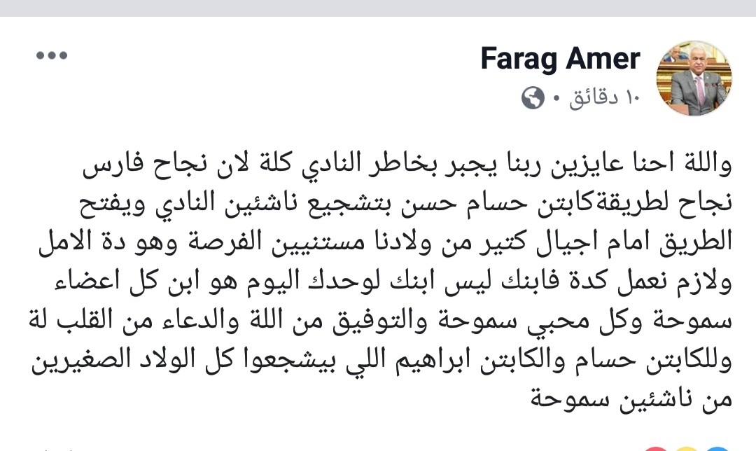 وقال عامر عبر موقع التواصل الإجتماعي “فيس بوك”: “والله إحنا عايزين ربنا يجبر بخاطر النادي كلة لأن نجاح فارس نجاح لطريقة كابتن حسام حسن بتشجيع ناشئين النادي”.