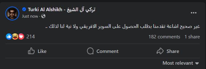 وكتب تركي الشيخ، عبر حسابه على موقع التواصل الاجتماعي “فيسبوك”: “غير صحيح إشاعة تقدمنا بطلب الحصول على السوبر الأفريقي ولا نية لنا لذلك”.