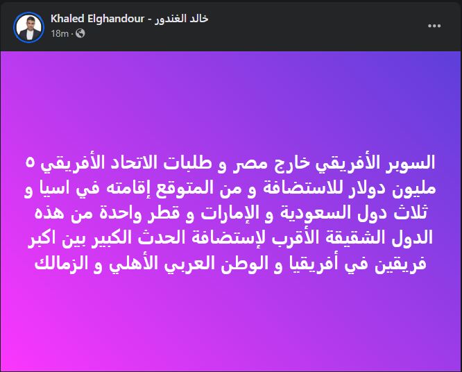 فجّر الإعلامي خالد الغندور، مفاجأة من العيار الثقيل بشأن إقامة مباراة السوبر الأفريقي 2024، بين الأهلي والزمالك، أبطال دوري أبطال أفريقيا والكونفدرالية.