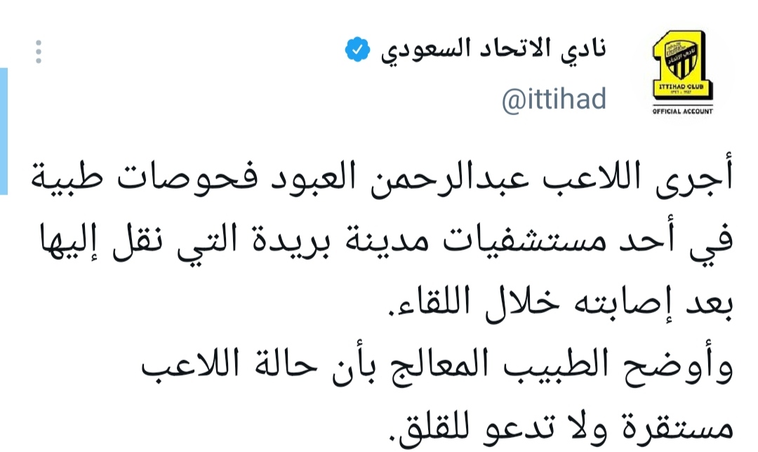 ونشر الحساب الرسمي لنادي اتحاد جدة عبر موقع التواصل الاجتماعي “تويتر”: “أجرى اللاعب عبدالرحمن العبود فحوصات طبية في أحد مستشفيات مدينة بريدة التي نقل إليها بعد إصابته خلال اللقاء”.
