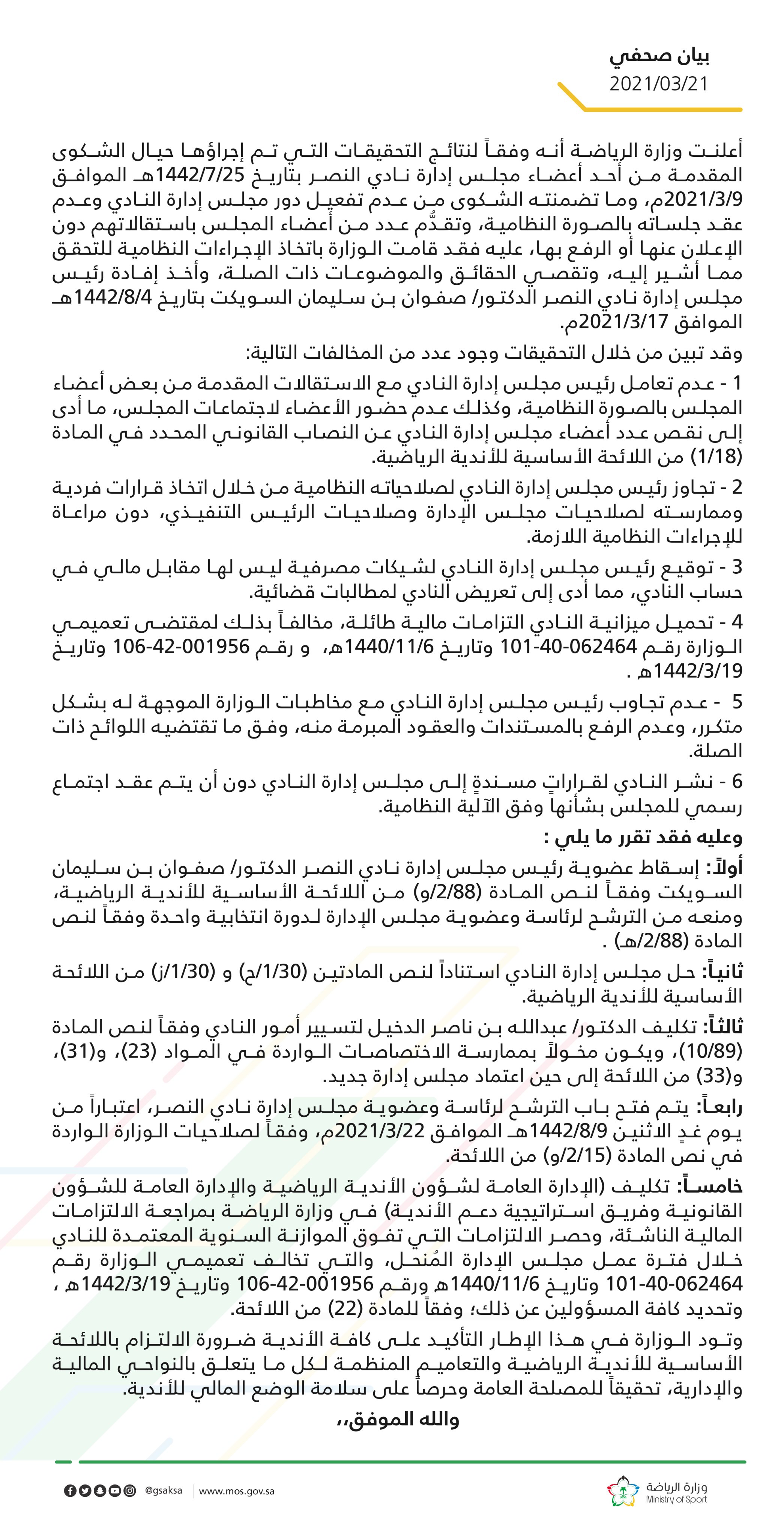 كما تقدم عدد من أعضاء المجلس باستقالاتهم دون الإعلان عنها أو الرفع بها، عليه فقد قامت الوزارة باتخاذ الإجراءات النظامية للتحقق مما أشير إليه، وتقصي الحقائق والموضوعات ذات الصلة، وأخذ إفادة رئيس مجلس إدارة نادي النصر الدكتور/ صفوان بن سليمان السويكت.