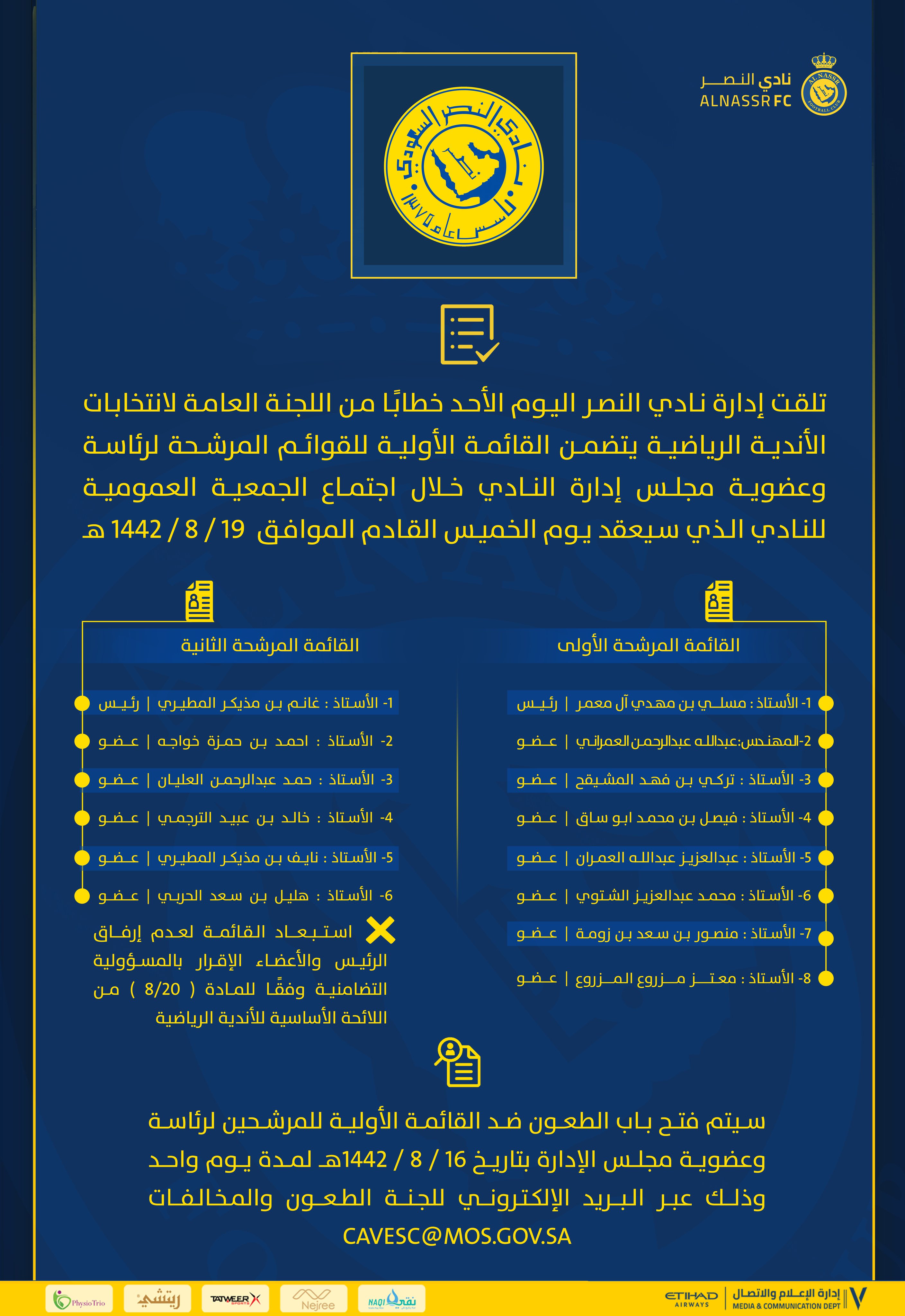 أعلن نادي النصر اليوم الأحد، عن القوائم الأولية المرشحة لرئاسة وعضوية مجلس إدارة العالمي خلال الانتخابات المقبلة.