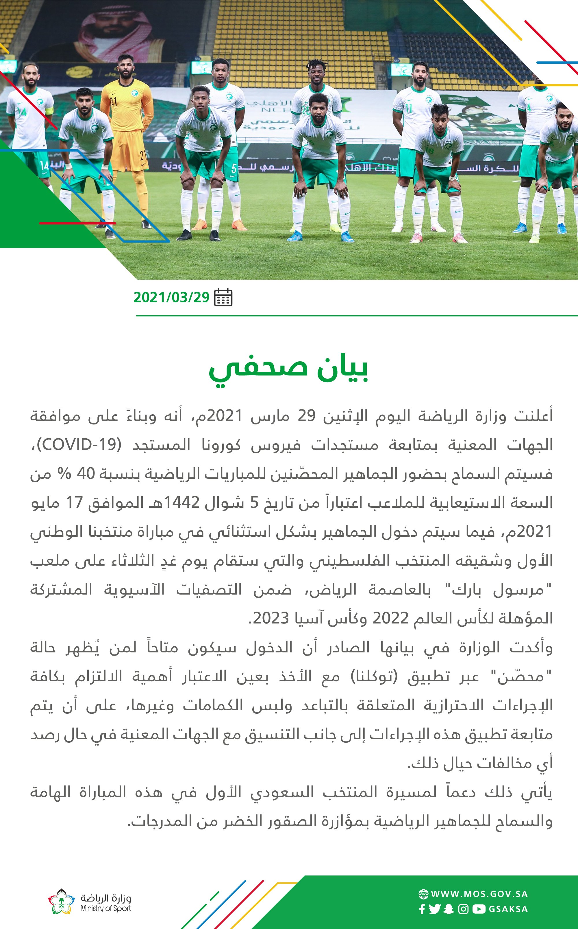 أعلنت وزارة الرياضة السعودية اليوم الإثنين، عن عودة الجماهير للملاعب السعودية مرة أخرى، وذلك بعد موافقة الجهات المعنية بمتابعة مستجدات فيروس كورونا.