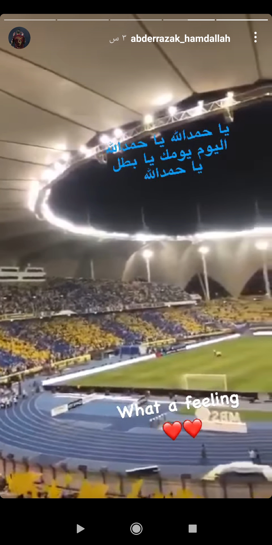ونشر حمد الله فيديو عبر الإستوري الخاص به بموقع التواصل الاجتماعي “انستجرام” لجماهير نادي النصر وهم يهتفون بإسمه في إحدى المباريات، حيث علق عليها ب:”ما هذا الأحساس”.