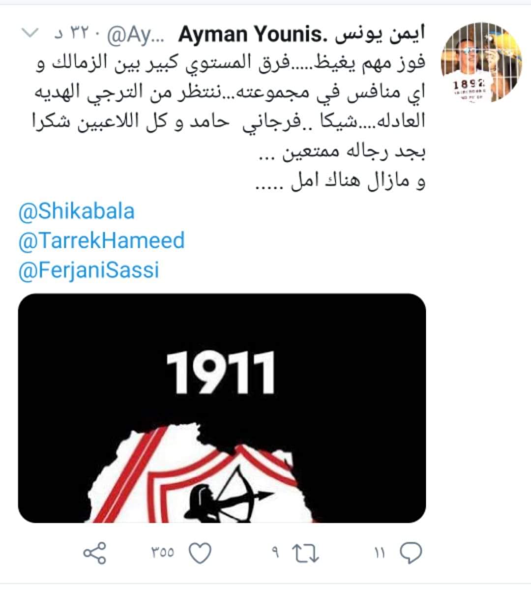 واختتم: “شيكا ..فرجاني حامد و كل اللاعبين شكرًا بجد رجالة ممتعين …و مازال هناك امل”.