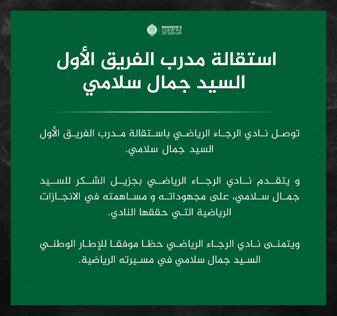 أعلن نادي الرجاء البيضاوي المغربي رحيل جمال السلامي المدير الفني للفريق، قبل يومين فقط من مواجهة فريق بيراميدز، في المباراة المقرر لها التاسعة مساء يوم الأحد القادم على استاد الدفاع الجوي، لحساب مباريات الجولة الرابعة من دور المجموعات لبطولة الكونفيدرالية الأفريقية.