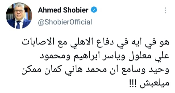 وكتب “شوبير” عبر حسابه الشخصي «تويتر»: “هو في ايه في دفاع الأهلي مع الإصابات”.