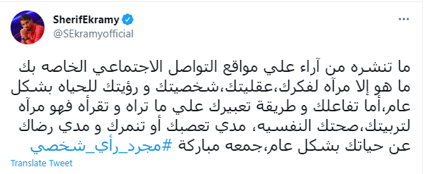 وكتب ”شريف” عبر حسابه الشخصي بموقع «تويتر»: “ما تنشره من آراء علي مواقع التواصل الاجتماعي الخاصه بك ما هو إلا مرآه لفكرك،عقليتك،شخصيتك و رؤيتك للحياه بشكل عام”.