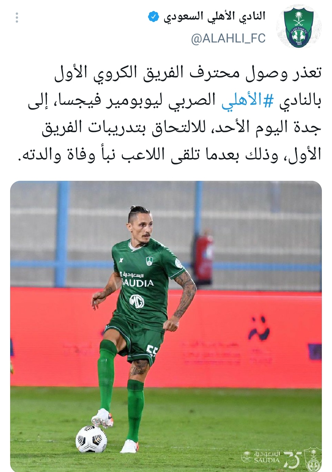 وكتب الحساب الرسمي لأهلي جدة عبر موقع التواصل الاجتماعي “تويتر” تعذر وصول محترف الفريق الكروي الأول بالنادي الأهلي الصربي ليوبومير فيجسا، إلى جدة اليوم الأحد، للالتحاق بتدريبات الفريق، وذلك بعدما تلقى اللاعب نبأ وفاة والدته”.