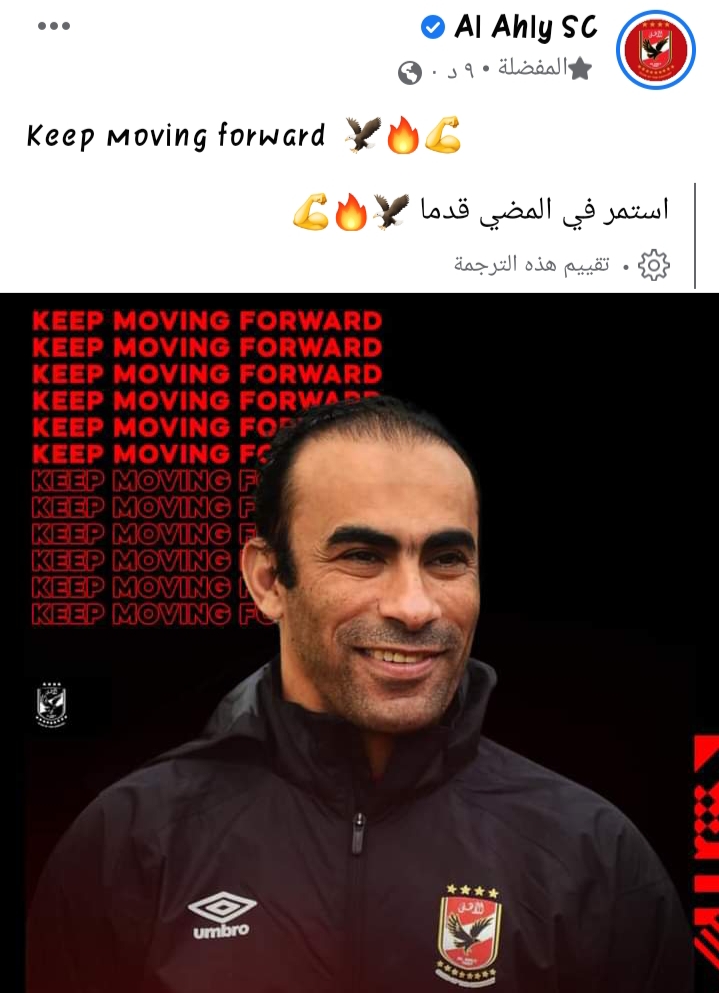 ونشر النادي الأهلي عبر حسابه الرسمي على موقع التواصل الاجتماعي فيسبوك، صورة لسيد عبدالحفيظ، وعلق عليها، “استمر في المضي قدمًا”.