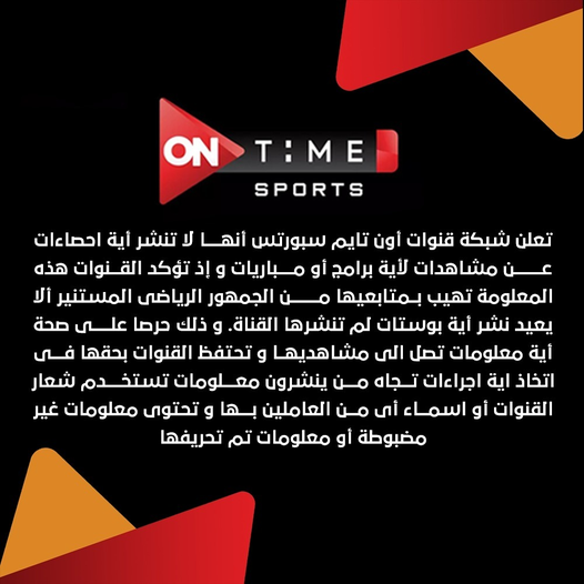 تعلن شبكة قنوات أون تايم سبورتس أنها لا تنشر أية احصاءات عن مشاهدات لأية برامج أو مباريات، وإذ تؤكد القنوات هذه المعلومة وتهيب بمتابعيها من الجمهور الرياضي المستنير ألا يعيد نشر أية بوستات لم تنشرها القناة، وذلك حرصا على صحة أية معلومات تصل إلى مشاهديها وتحتفظ القنوات بحقها في اتخاذ أية اجراءات تجاه من ينشرون معلومات تستخدم شعار القنوات أو أسماء أي من العاملين بها وتحتوي معلومات غير مضبوطة أو معلومات تم تحريفها.