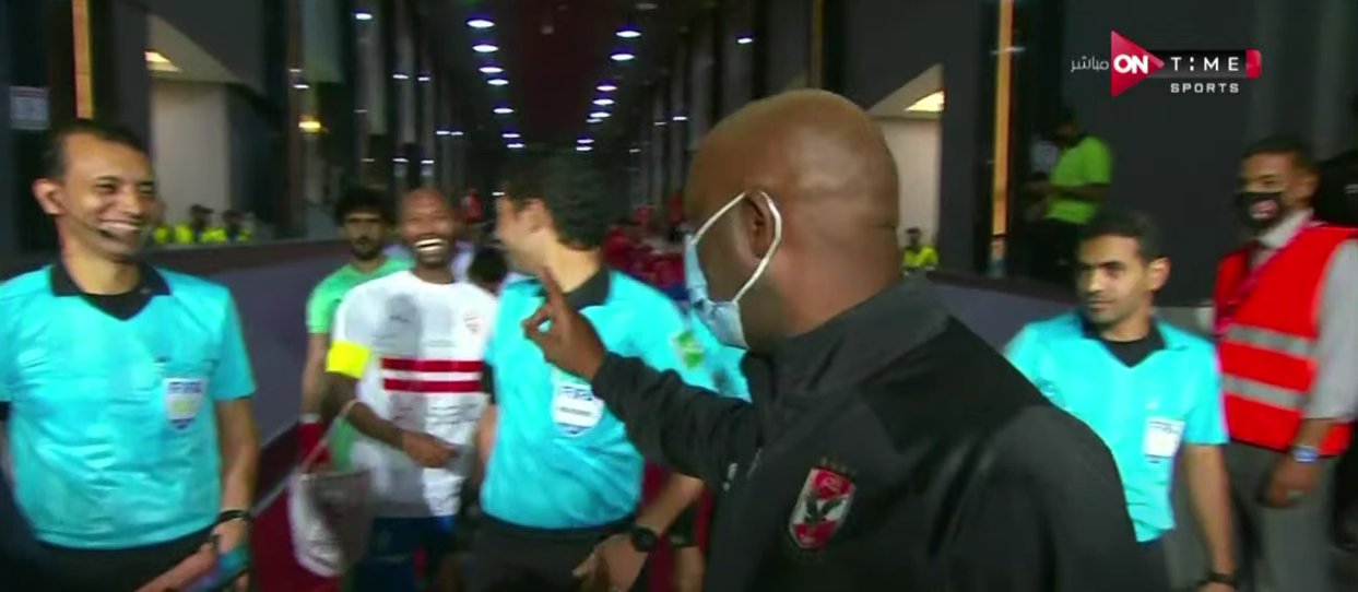 حرص الجنوب أفريقي بيتسو موسيماني المدير الفني للفريق الأول لكرة القدم بالنادي الأهلي على مداعبة محمود عبد الرازق شبكابالا صانع ألعاب الزمالك قبل بدء مباراة القمة 122.