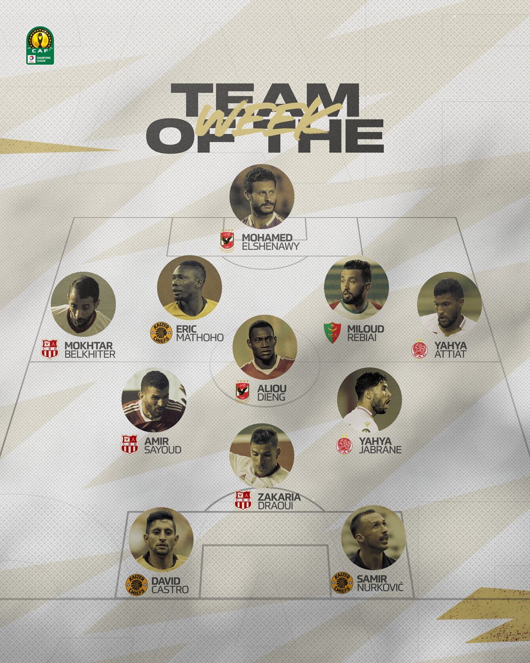 وشهدت التشكيلة الأفضل في ذهاب دور ربع نهائي دوري أبطال إفريقيا، تواجد ثنائي الفريق الأول لكرة القدم بالنادي الأهلي، محمد الشناوي حارس المرمى، وأليو ديانج لاعب وسط الفريق.