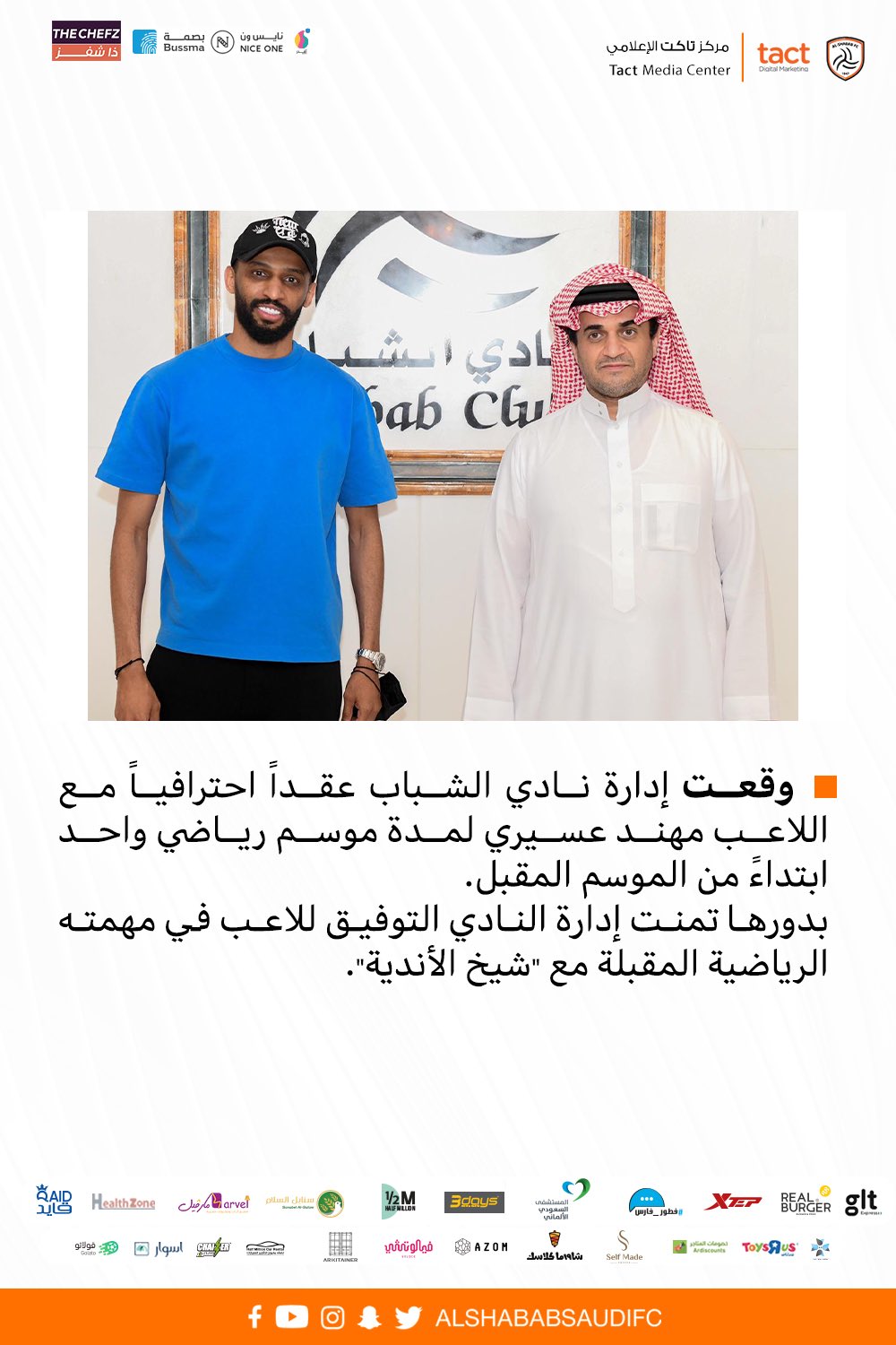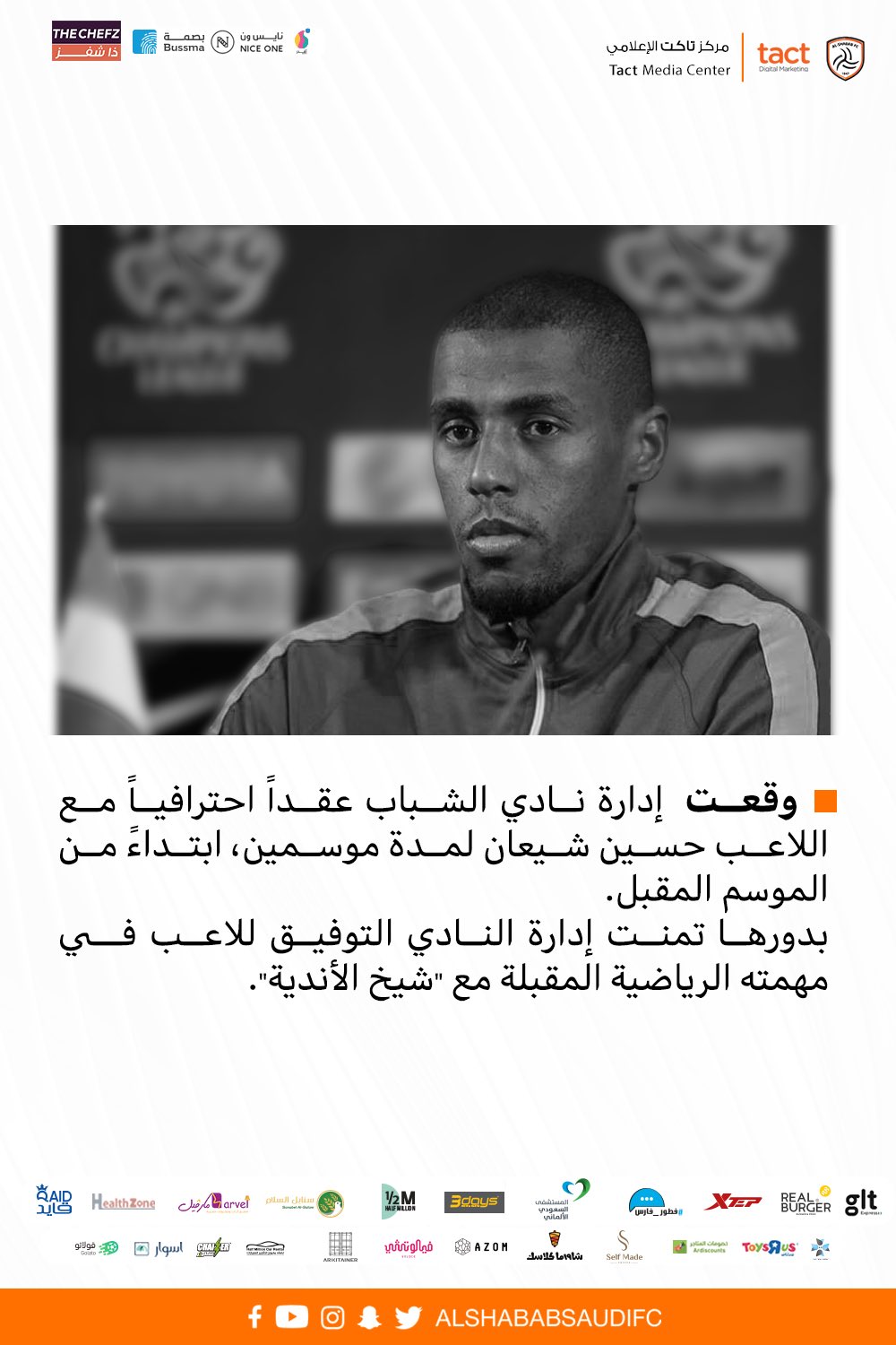 وكتب الحساب الرسمي لنادي الشباب بموقع التواصل الاجتماعي “تويتر” تم التعاقد مع حسين الشيعان حارس مرمى نادي النصر السابق لمدة موسمين قادمين، فيما تم ضم مهند عسيري مهاجم أهلي جدة في صفقة انتقال حر لمدة موسم”.