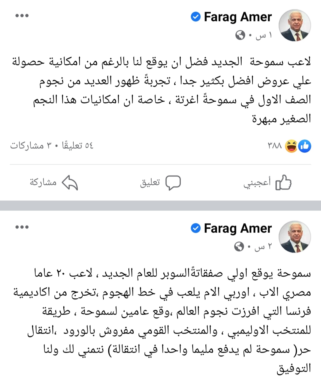 وأضاف : “هذا اللاعب تخرج في أكاديمية فرنسا التي أفرزت نجوم العالم، وقع عامين لسموحة، طريقة للمنتخب الاوليمبي والمنتخب القومي مفروش بالورود، انتقال حر».